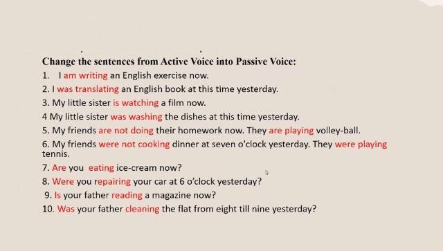 5. Homework isn't being done now by my friends. Volley-ball is being played now by them.