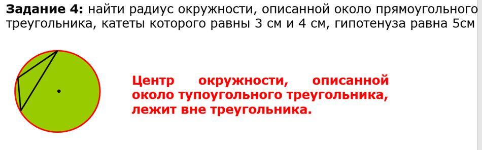 В прямоугольном треугольнике центр описанной окружности является серединой гипотенузы, а радиус равен половине гипотенузы или медиане, проведённой к гипотенузе.