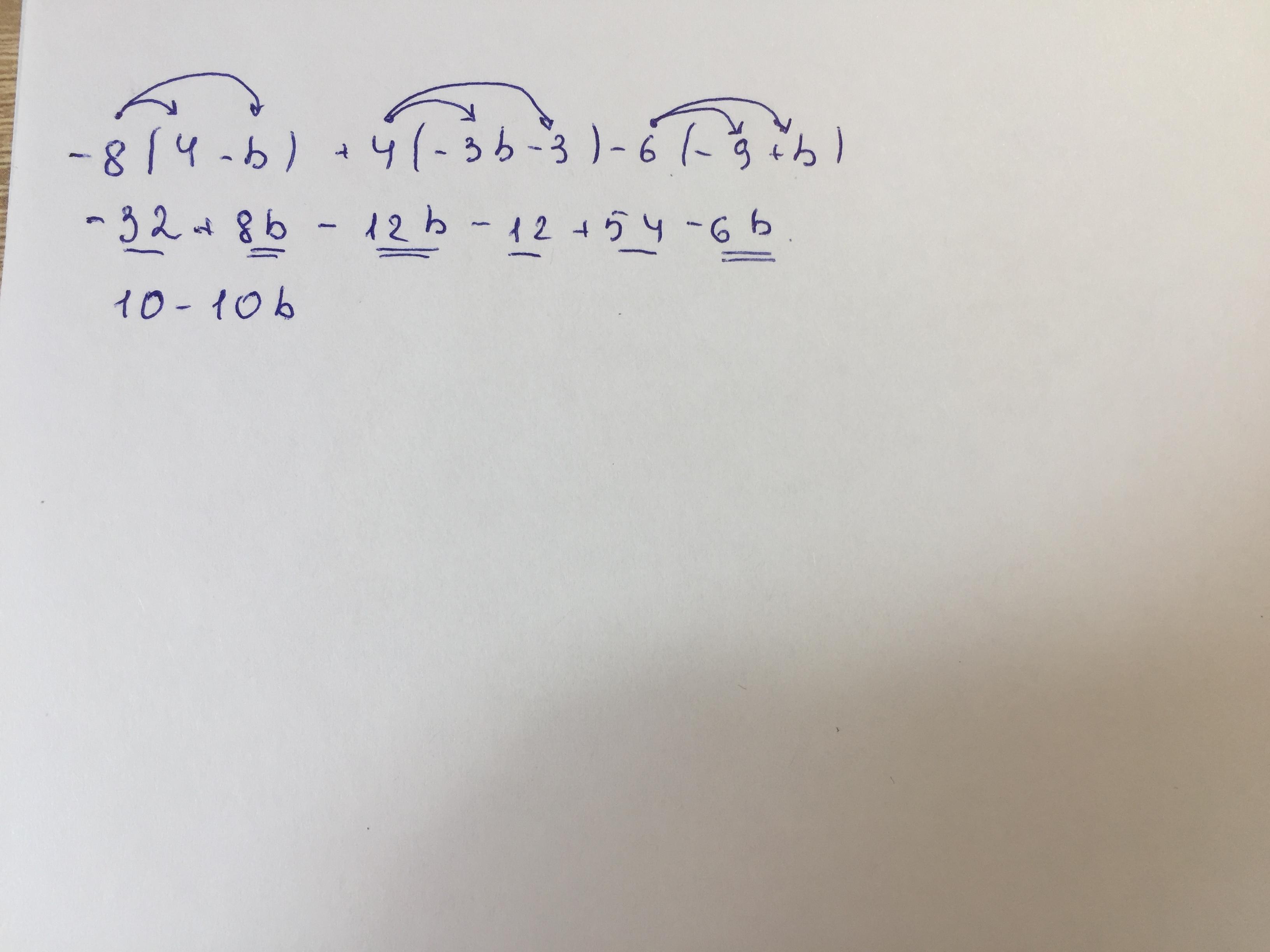 -8(4-b)+4(-3b-3)-6(-9+b) = -32 +8b -12b -12 +54 -6b = -10b + 10