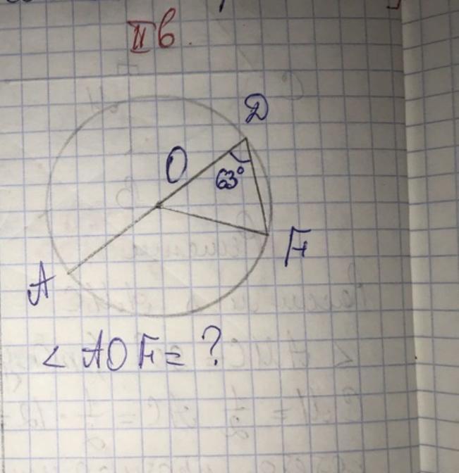 Угол АDF и угол AOF - это соответственно вписанный и центральный углы, опирающиеся на одну дугу AF, значит, центральный искомый угол в два раза больше вписанного и равен 63°*2=126°