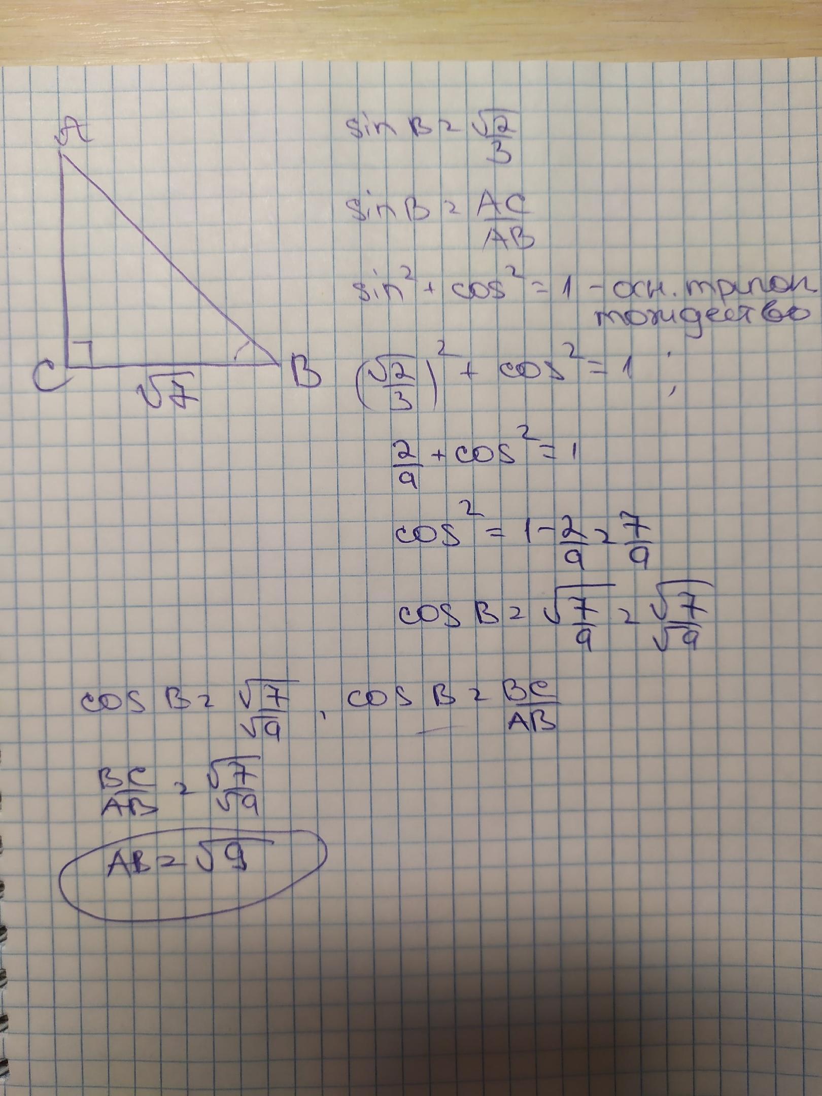 В треугольнике ABC угол C равен 90°, sin B=√2/3, BC=√7. Найдите AB.