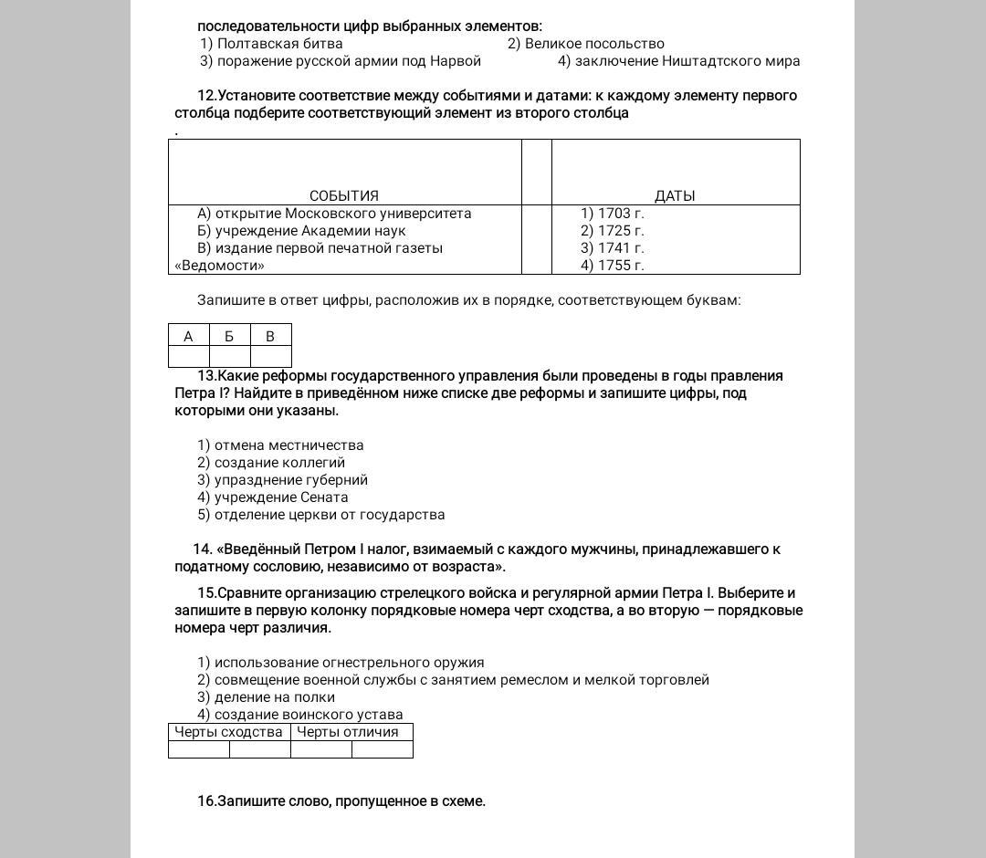 13. Какие реформы государственного управления были проведены в годы правления Петра I? Найдите в приведённом ниже списке две реформы и запишите цифры, под которыми они указаны.