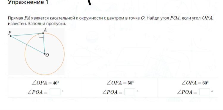1. угол ОРА=40° => угол РОА=180-(90+40)=180-130=50°.