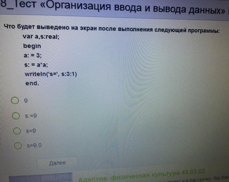 Скорее всего S=9, т.к S= выводится, а потом значение