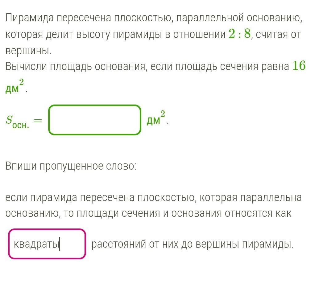 Сечение пирамиды плоскостью, параллельной ее основанию (перпендикулярной высоте) есть многоугольник, подобный основанию пирамиды, причем коэффициент подобия этих многоугольников равен отношению их расстояний от вершины пирамиды.