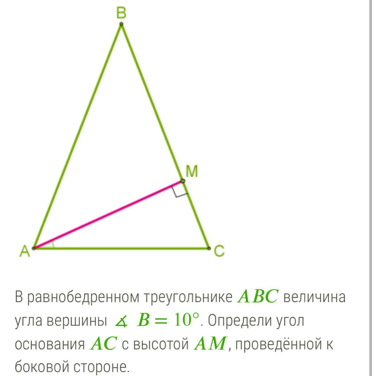 В равнобедренном треугольнике величина угла вершины ∡ = 10°. Определи угол основания с высотой , проведённой к боковой стороне.
