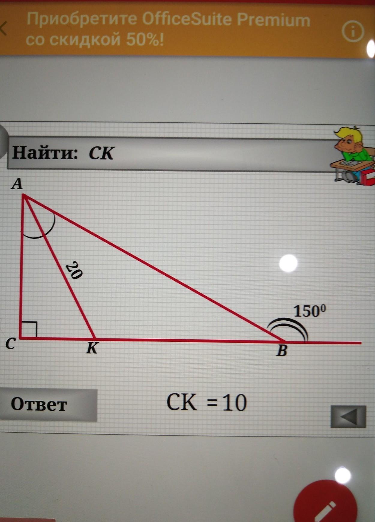 маленький треугольник это прямоугольный треугольник.Есть треугольники 30 60 90 градусов и 45 45 90 градусов.У каждого из них есть свои пропорции.20:2=10.Значит а=10.Дальше просто под а подставляешь 10.Поэтому,СК=10