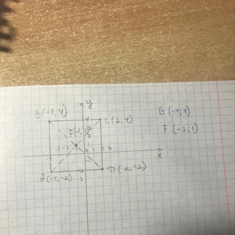 Дано координати трьох вершин прямокутника ABCD: A(–4; –2) C(2; 4) D(2; –2). Накреслять цей прямокутник. Знайдіть координати вершин В. Позначте та знайдіть координати точки перетину діагоналей прямокутника.