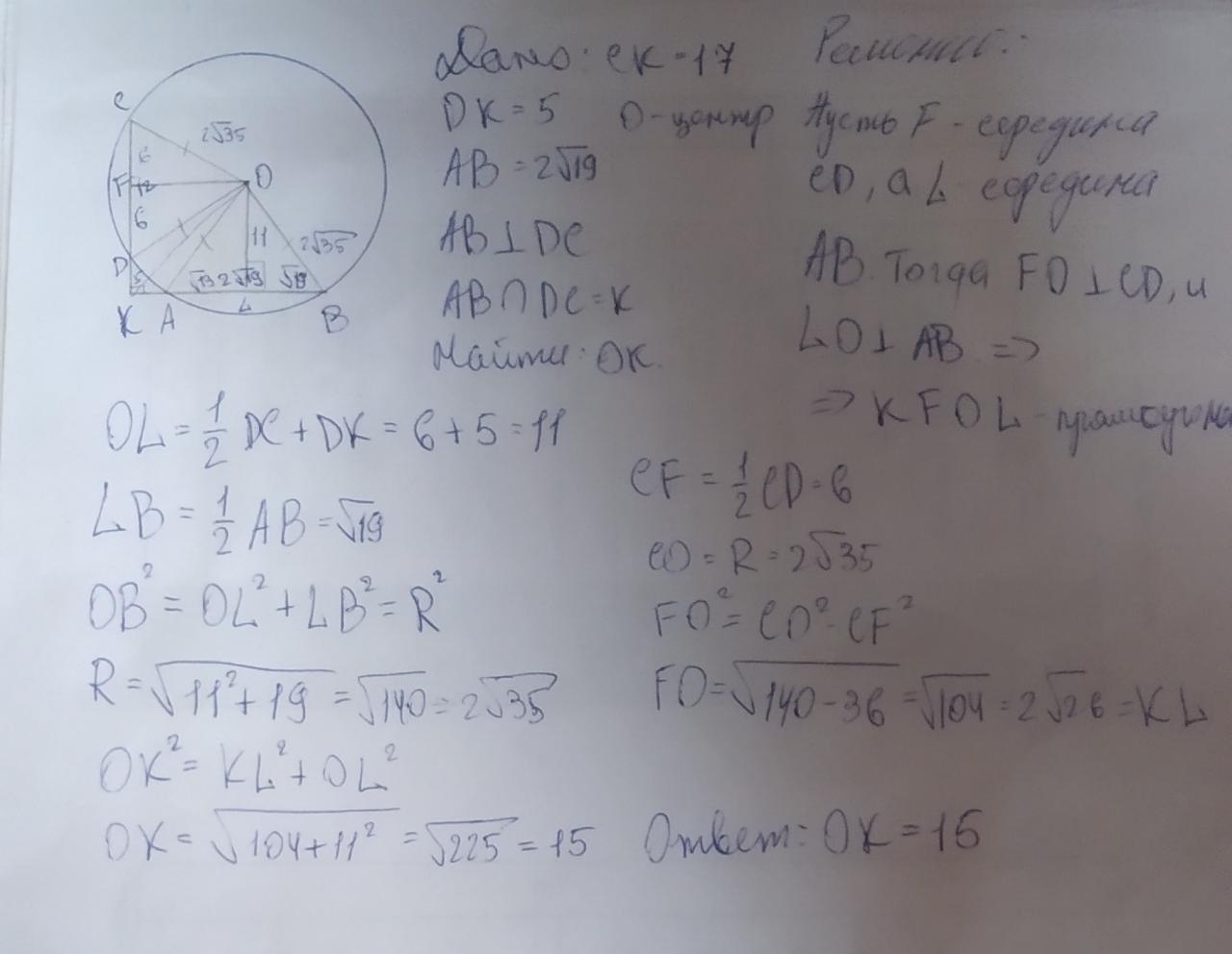 В окружности с центром в точке O проведены две хорды AB и CD. Прямые AB и CD перпендикулярны и пересекаются в точке K, лежащей вне окружности. При этом CK=17, DK=5, AB=2√19 . Найдите OK.
