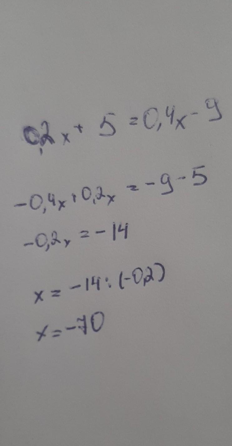 Реши уравнение, используя основное свойство пропорции (если ab=cd, то a⋅d=b⋅c): 0,2x+5=0,4x−9. Ответ (для отрицательной дроби используй знак «−»): x= .