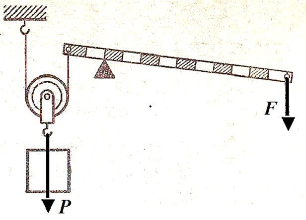 Чему равен вес груза P, который поднимают с помощью комбинации рычага и блока, прилагая силу F = 30 Н?
