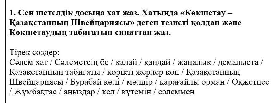 Сәлеметсің бе? Жағдайың қалай? Не жаңалық? Шетелде қандай екен? Ал, бізде Көкшетау-Қазақстанның Швейцариясы. Қазақстанның табиғатына сөз жоқ! Қазақстанда Бурабай көлі бар, ол мөлдір, таза!