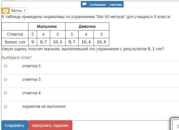 В таблице приведены нормативы по упражнению "Бег 60 метров" для учащихся 8 класса: