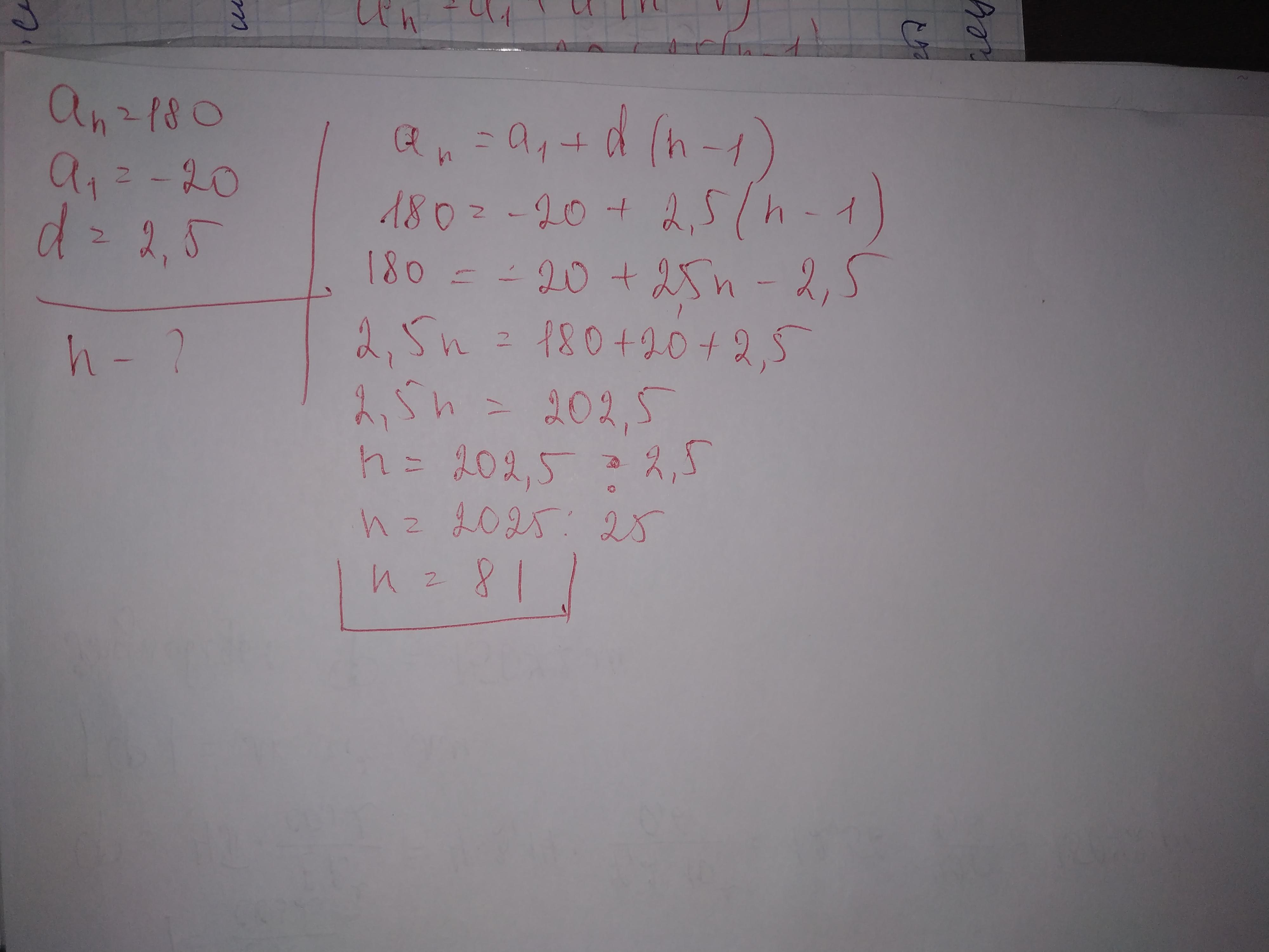 Какой номер имеет член арифметической прогрессии, равный 180, если её первый член равен -20, а разность равна 2,5??