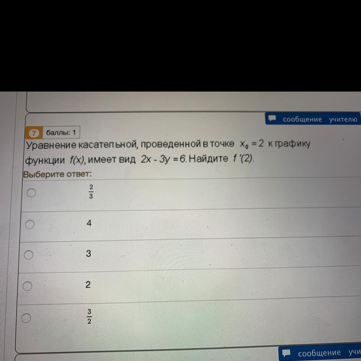 Уравнение касательной проведённой в точке x0=2 К графику функции f(x) имеет вид 2x-3y=6. Найдите f’(2)