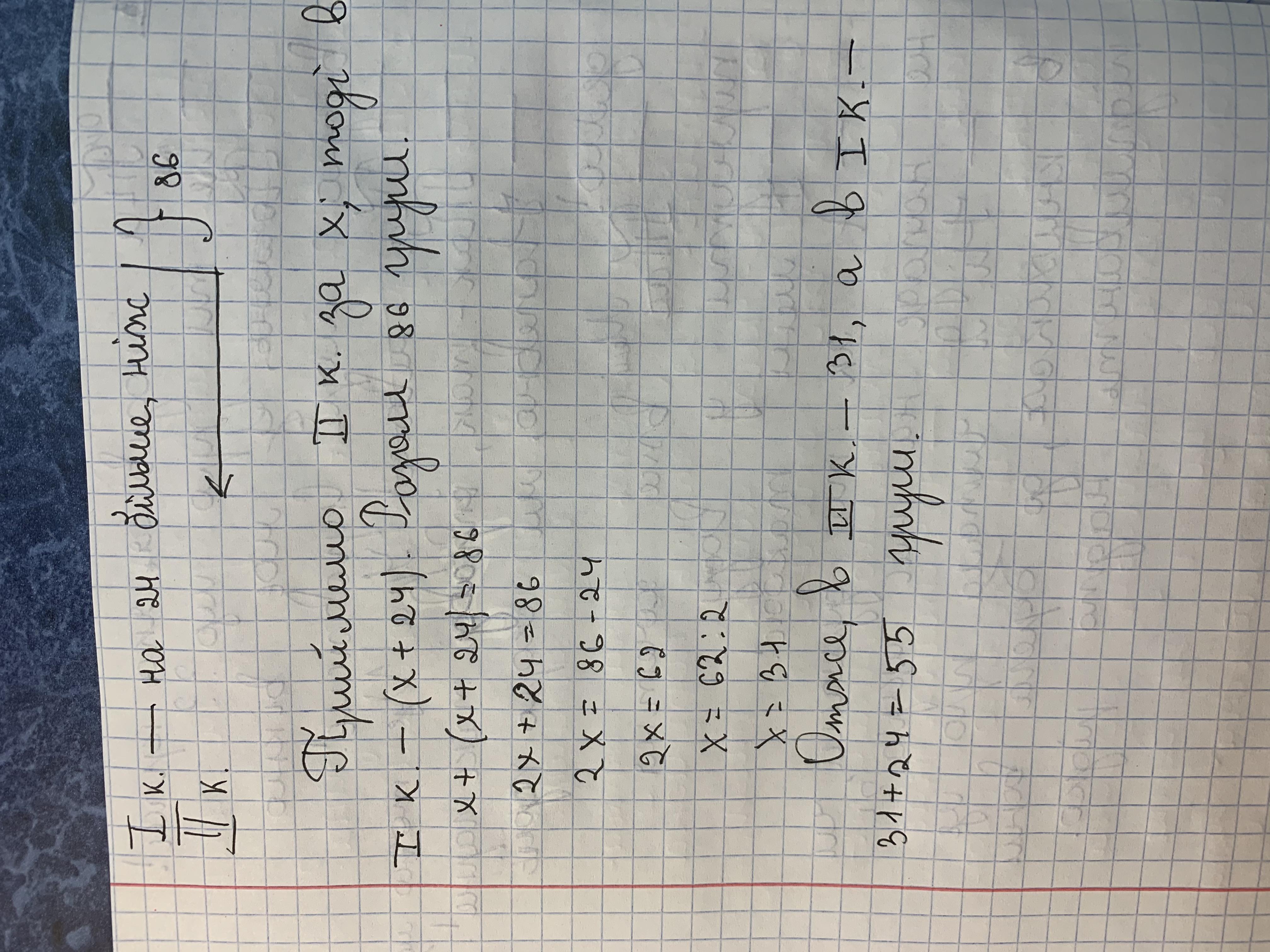 у двох кошиках 86 груш причому в одному кошику на 24 груш більше ніж другому Скільки груш кожному кошику