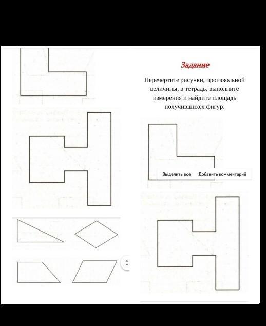 реши квадратами и прямоугольниками(дели фигуры на них)(первые 4 больших рисунка(длину * на ширину)), а ромбы - прямоугольниками и (прямоугольными) треугольниками, а их умножай на 2(чтоб получился прямоугольник) - получится квадрат, получи площадь(д.*ш.) и дели его на 2(если в фигуре есть такой же треугольник(зеркальный), то не дели, а пиши сразу ответ.