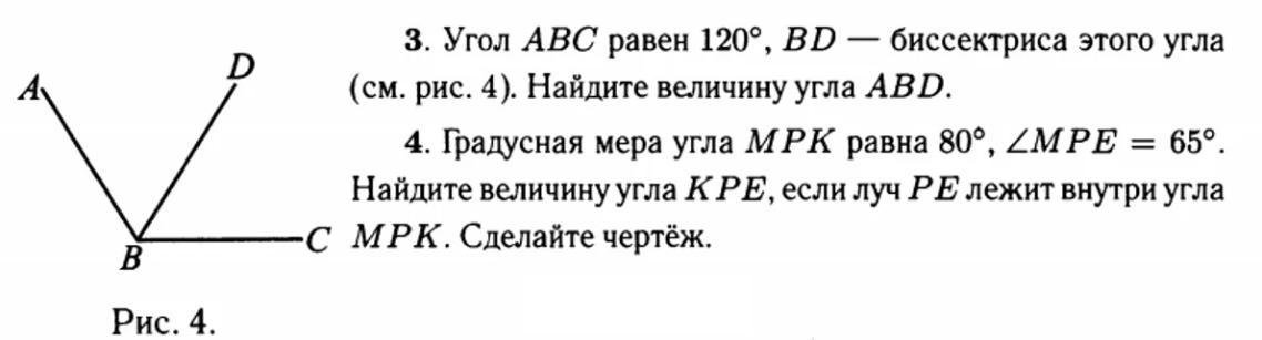 3.абд=60 градусов (половина угла абс),4. угол кпе = 15 градусов(80-65=15) чертёж как и в 3 задачи, только разные буквы и луч не по середине, а уходит не много в бок