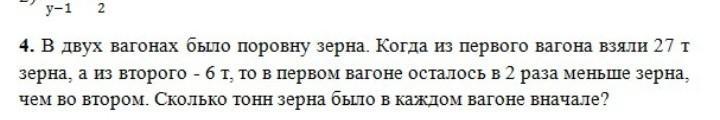 Пусть х - кг зерна в двух вагонах. С первого вагона взяли (х-27), а со второго - (х-6), в итоге, в первом вагоне оказалось в 2 р меньше , чем во втором.