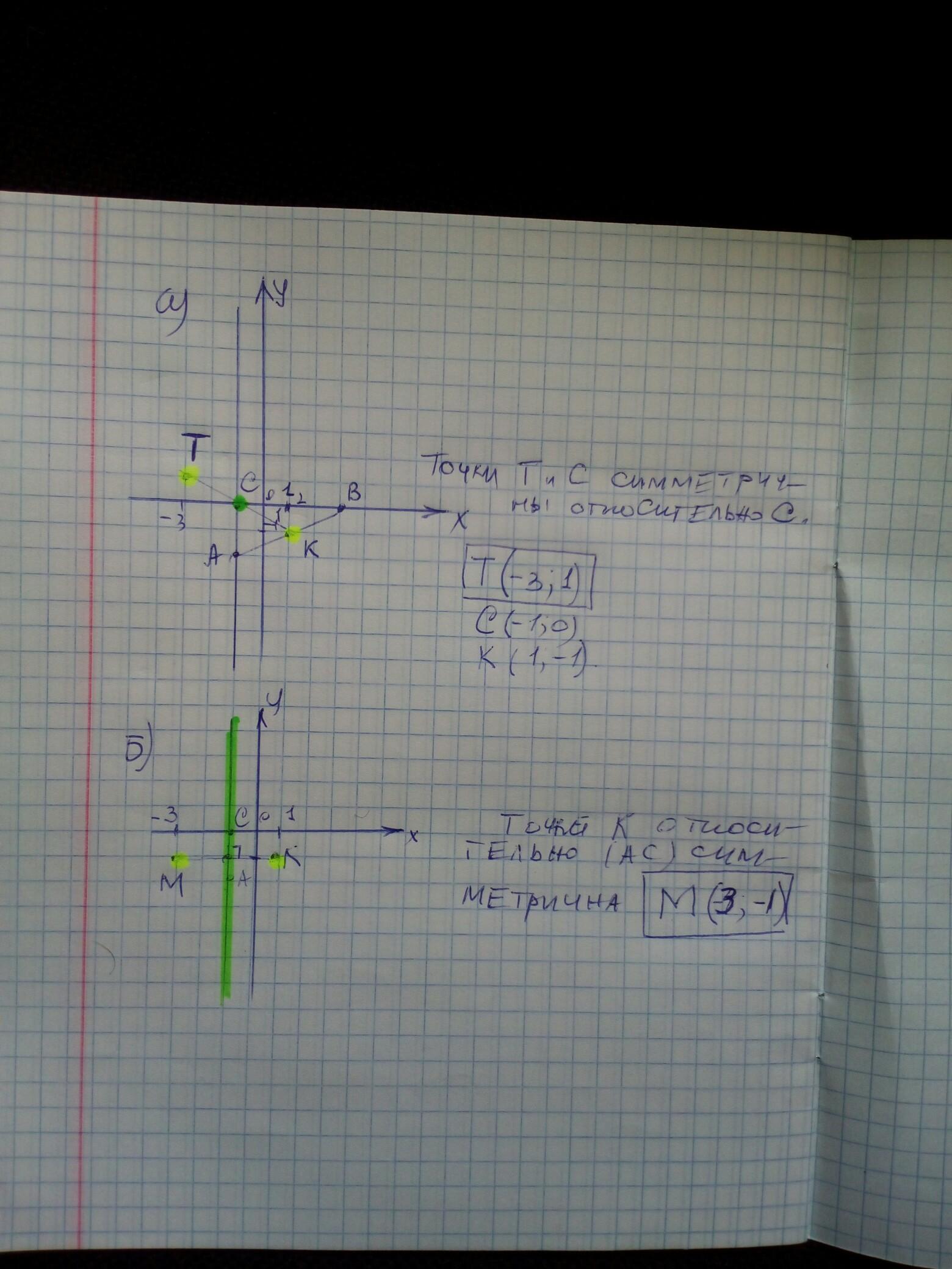 а) Найдем точку, симметричную середине отрезка АВ, относительно точки С. Пусть искомой будет точка Т(х;у), а середину АВ назовем К и найдем, сложив соответствующие координаты точек А и В, и поделив сумму на два.