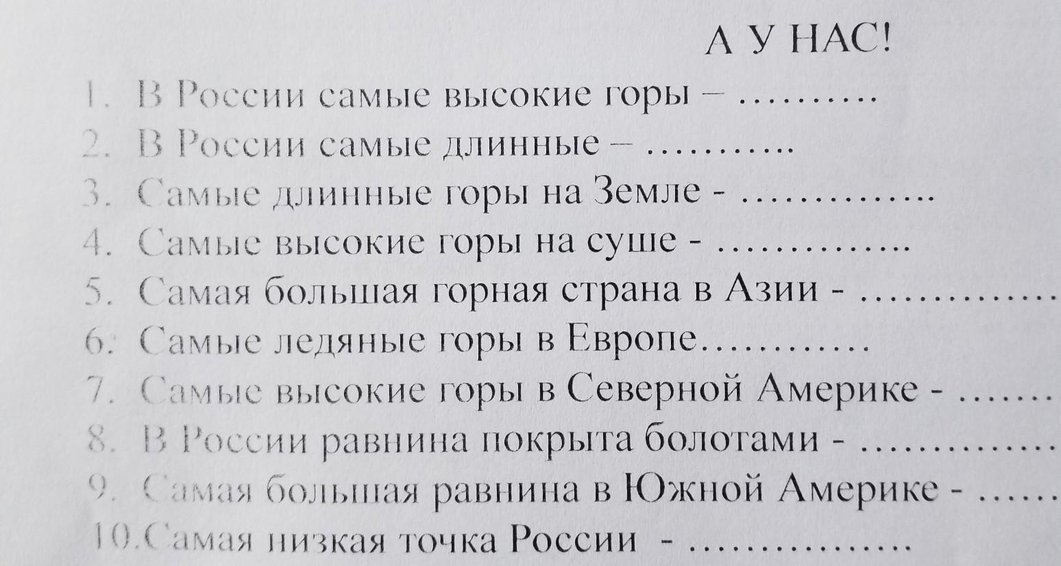 1самые длинные горы на земле.2 самые высокие горы на суше 3самая большая горная страна в азии 4самые леденные горы в Европе 5 самые высокие горы в северной Америке 6в россии равнина покрыта болотами 7самая большая равнина в южной Америке 8самая низкая точка россии ПОМОГИТЕ ПОЖАЛУЙСТА ОЧЕНЬ НАДО!
