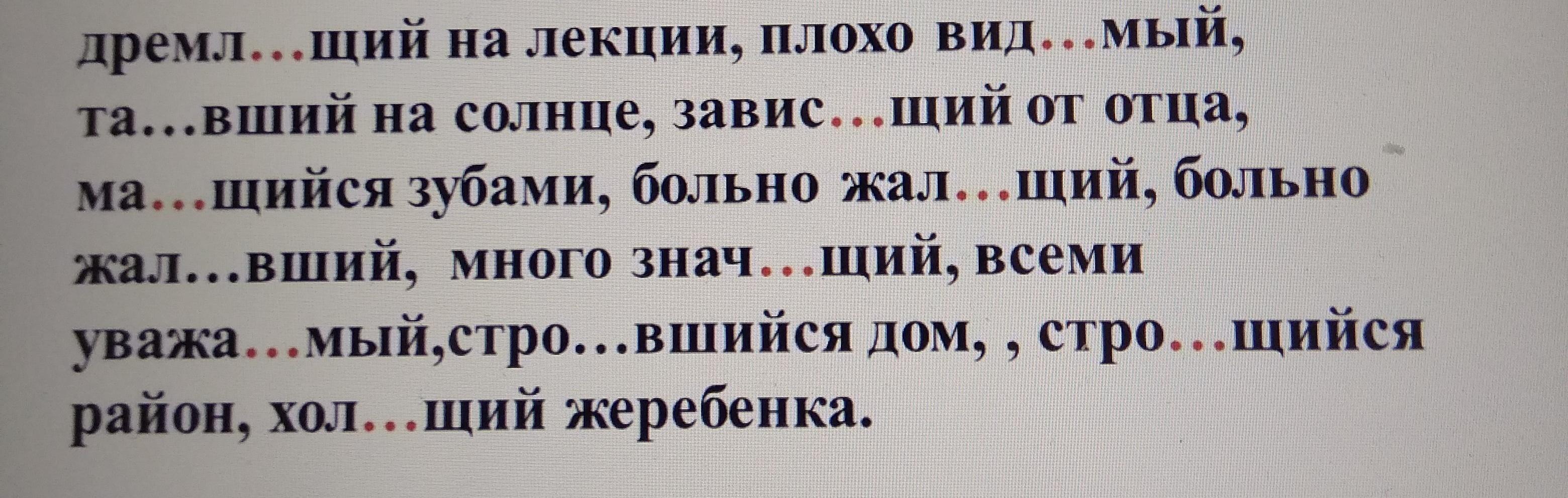 Дремлющий на лекции, плохо видимый, таявший на солнце, зависящий от отца, мающийся зубами, больно жалящий, больно жаливший, много значащий, всеми уважаемый, строившийся дом, строящийся район, холящий жеребёнка.