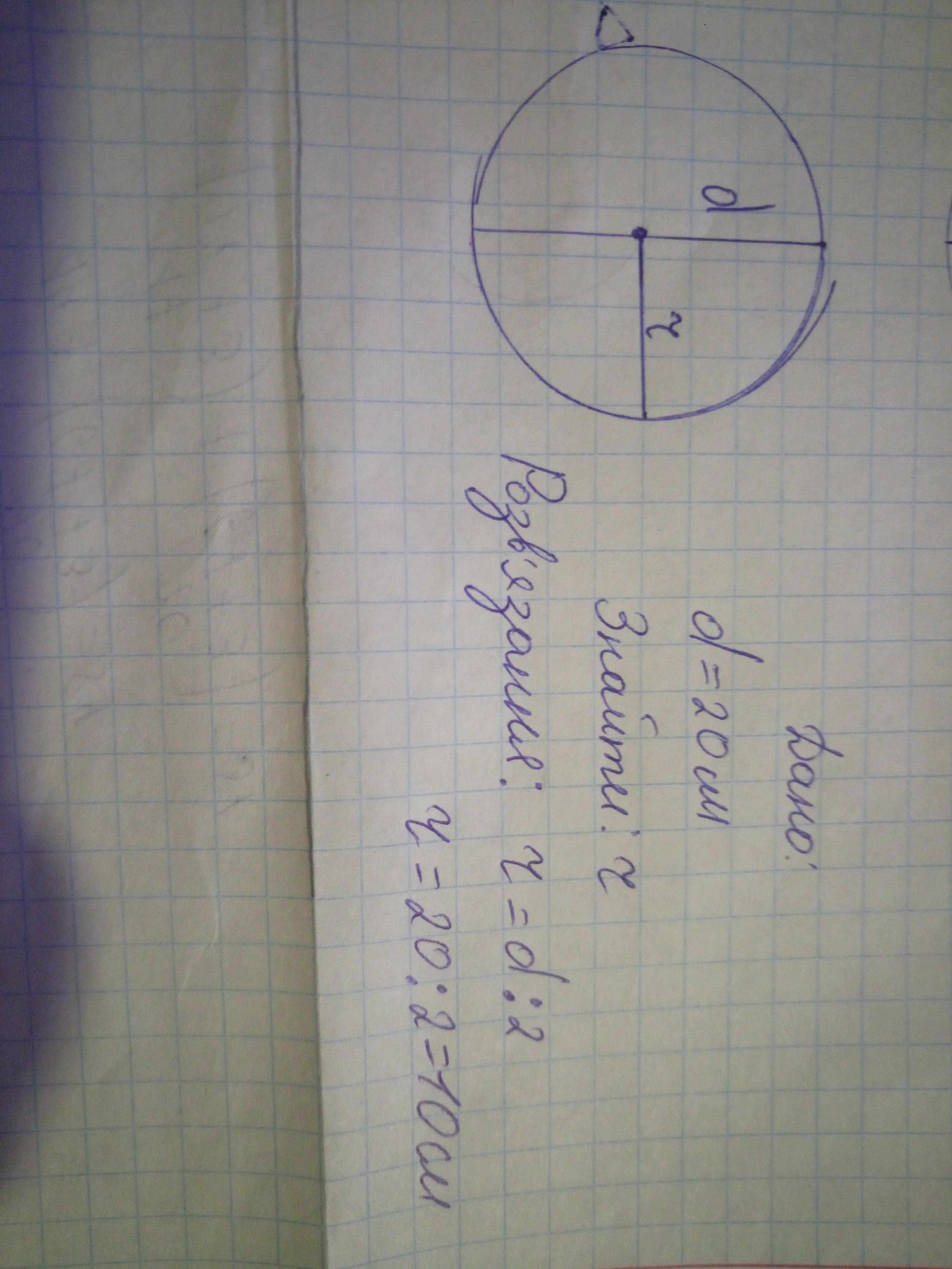 Знайдіть радіус кола діаметр якого дорівнює 20 см, пожалуйстатолько не просто ответ а само решение, кр нужно сделать до вечера