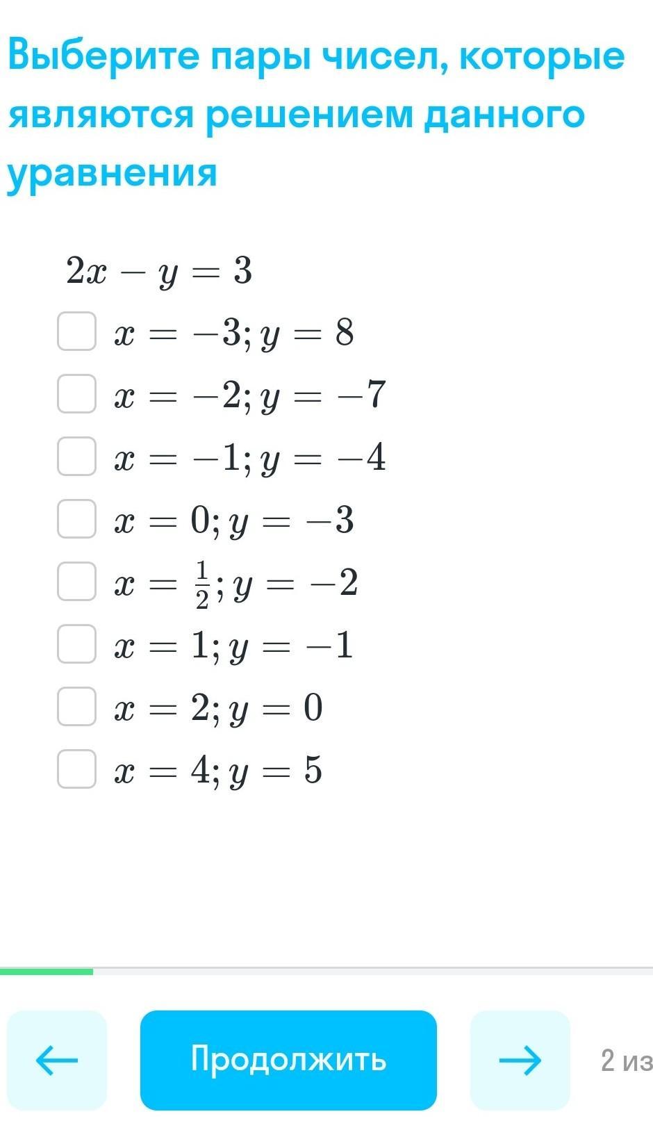 Выберите пары чисел, которые являются решением данного уравнения 2x-y=3. x=-3; y=8x=−3;y=8