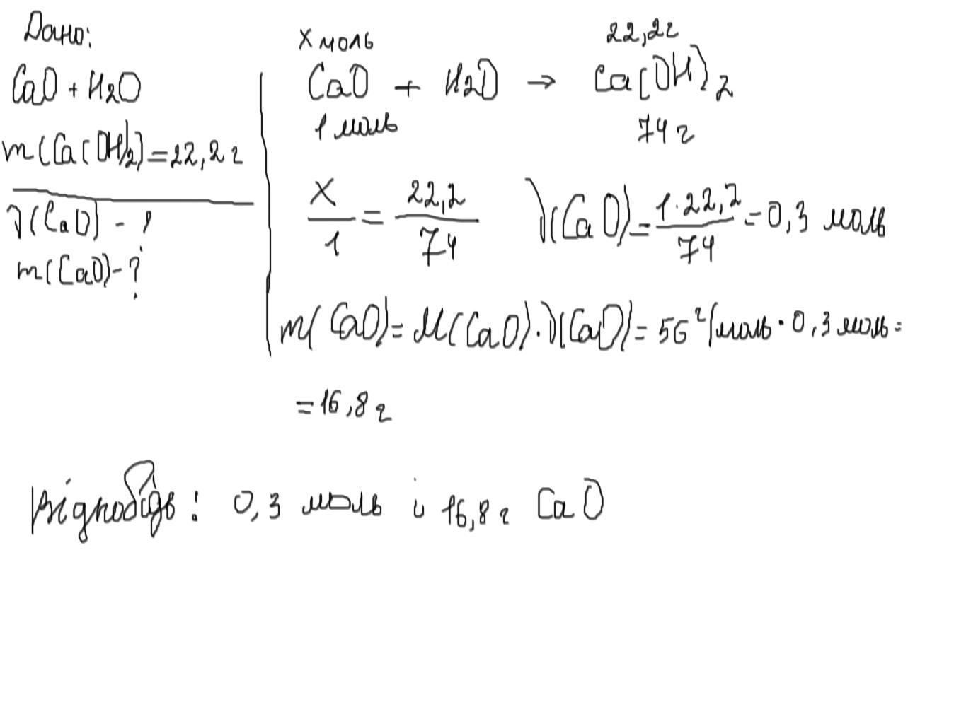 Кальцій оксид повністю прорегаував із водою, Маса утвореного кольцій гідроксиду- 22,2 г. Обчисліть кількість речовини та масу кальцій оксиду, що вступив у реакцію