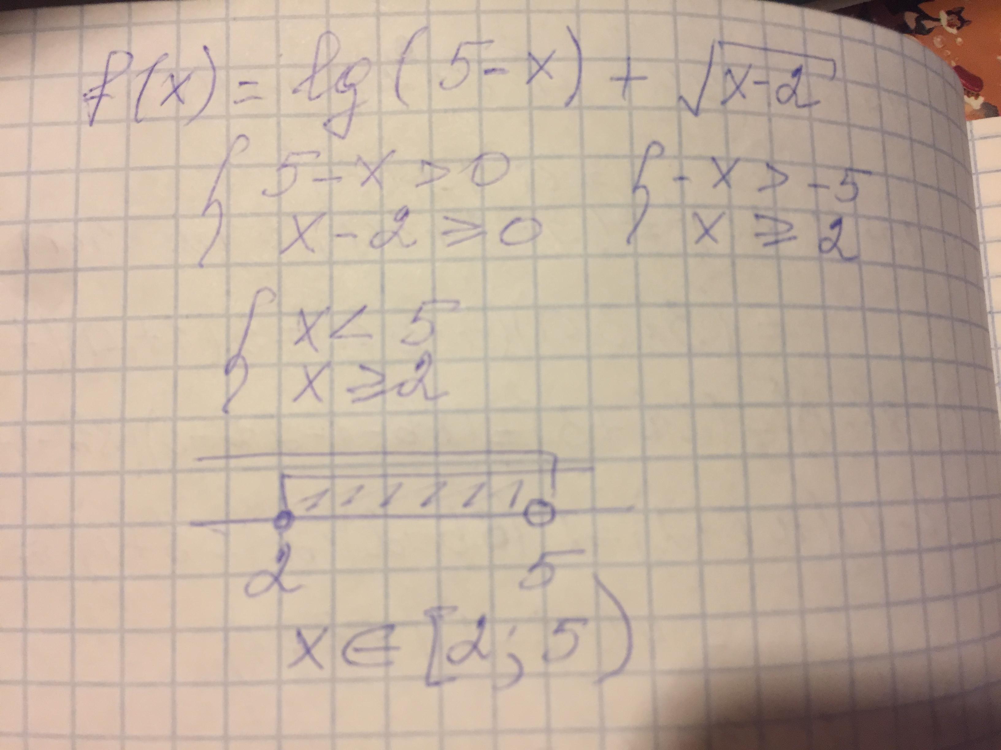 Срочно! Легко! Найдите область определения функции f(x) = lg(5-x) + √x-2