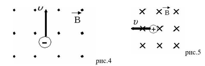 Куда направлена сила, действующая на электрон и протон, который движется, как показано на рисунке 4 и 5, со стороны магнитного поля? Какое правило используется для ответа на этот вопрос? Показать на рисунке направление силы.