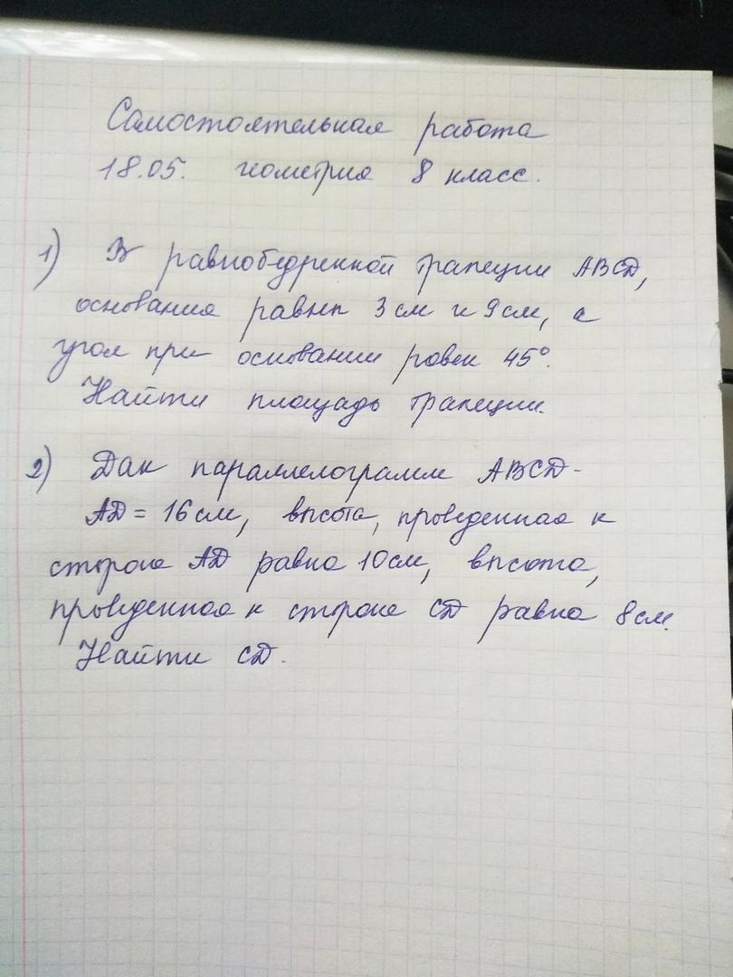 Проведём высоты BH и CN к стороне АD, получился прямоугольник, тогда HN=BC=3 cm, a AH=ND=3 cm. Следовательно, я треугольник АBH равнобедренный (так как угол А равен 45 градусов),а значит ВН=3см.