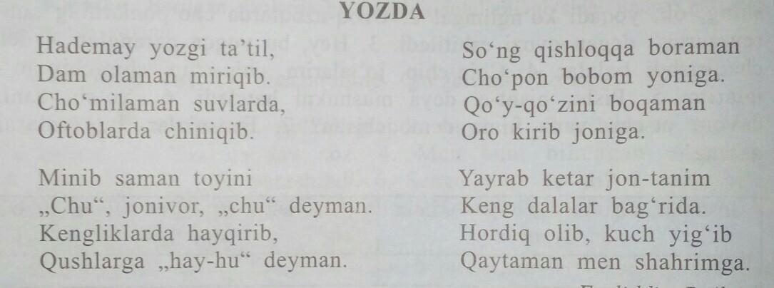 Yoz kelmoqda. Men yozgi ta'tilda mazza qilib dam olaman. Miriqib chòmilaman. Dalalarda ot minaman. Qishloqqa bobomni kòrgani boraman. Bobomni qòy qòzilarini boqib ularga yordam beraman. Dalalarda mazza qilib dam olaman. Ta'til tugagandan sòng yana shaharga qaytib kelaman.
