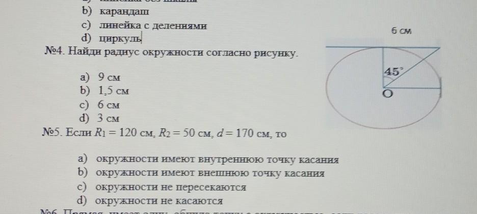 4) Радиус найдем через прямоугольный треугольник. Один из углов равен 45°, значит, катеты этого треугольника равны.