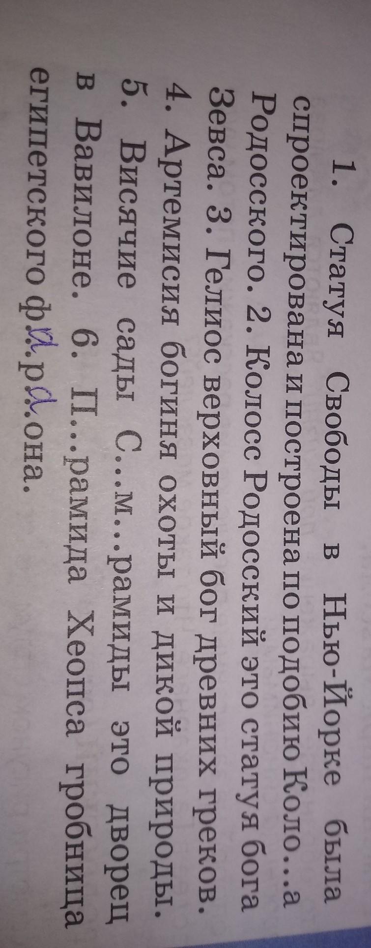 Статуя Свободы в Нью-Йорке, была спроектирована и построена по подобию Колосса Родосского. Колосс Родосский – это статуя бога Зевса. Гелиос – верховный бог древних греков. Артемисия – богиня охоты и дикой природы. Висячие сады Семирамиды – это дворец в Вавилоне. Пирамида Хеопса – гробница египетского фараона.