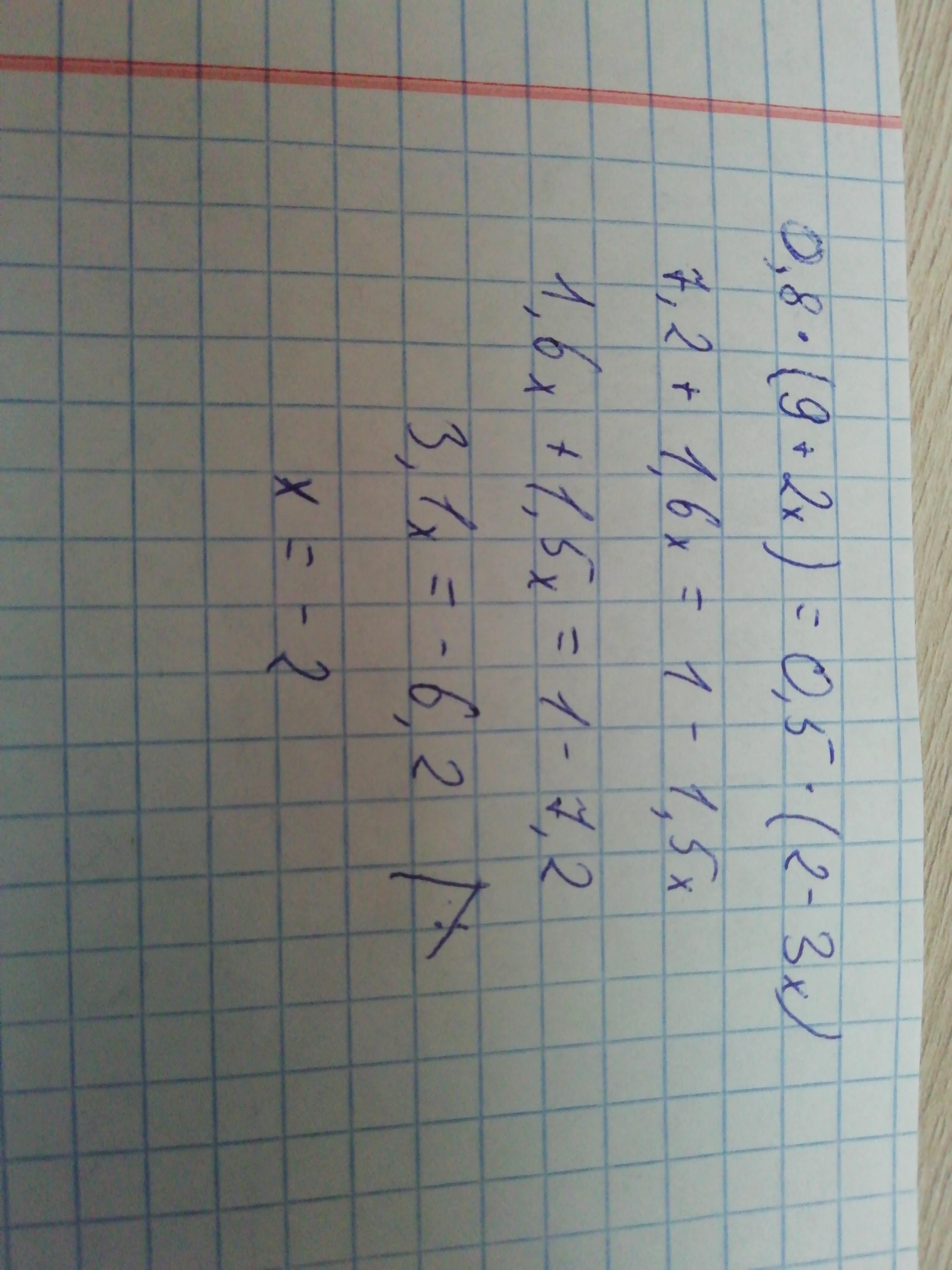 Как решить уравнение 0,8*(9+2х)=0,5*(2-3х)