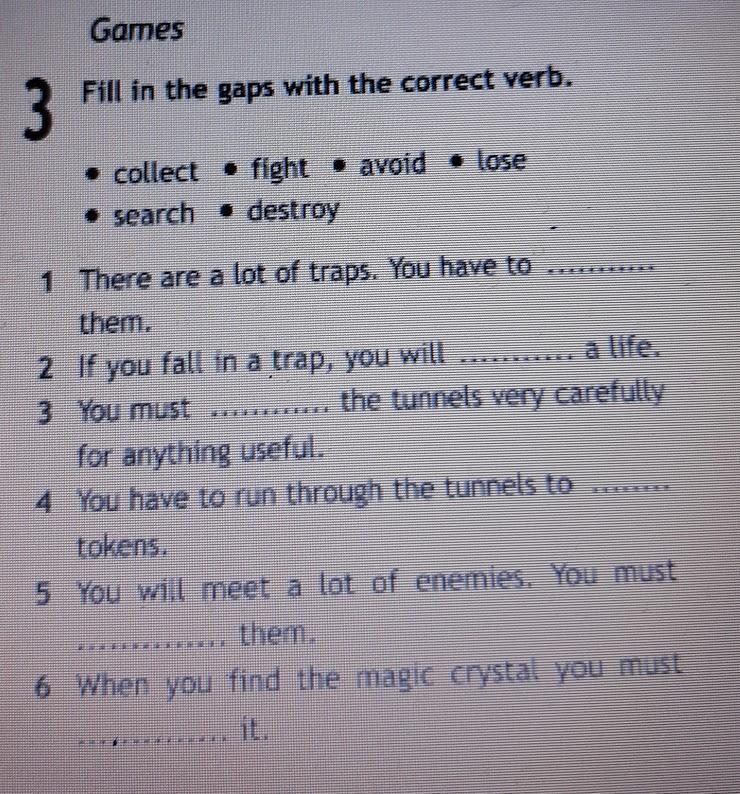 1 avoid 2 lose 3 search 4 collect 5 fight 6 destroy