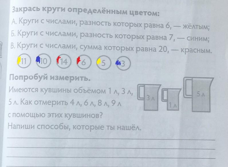 Ответ:Для того чтобы отмерить 4л нужно взять кувшин по 1л и 3л. Для 6л взять кувшин 5л и 1л. Для 8л взять 3л и 5л . Для 9л взять кувшин по 1л, 3л и 5л