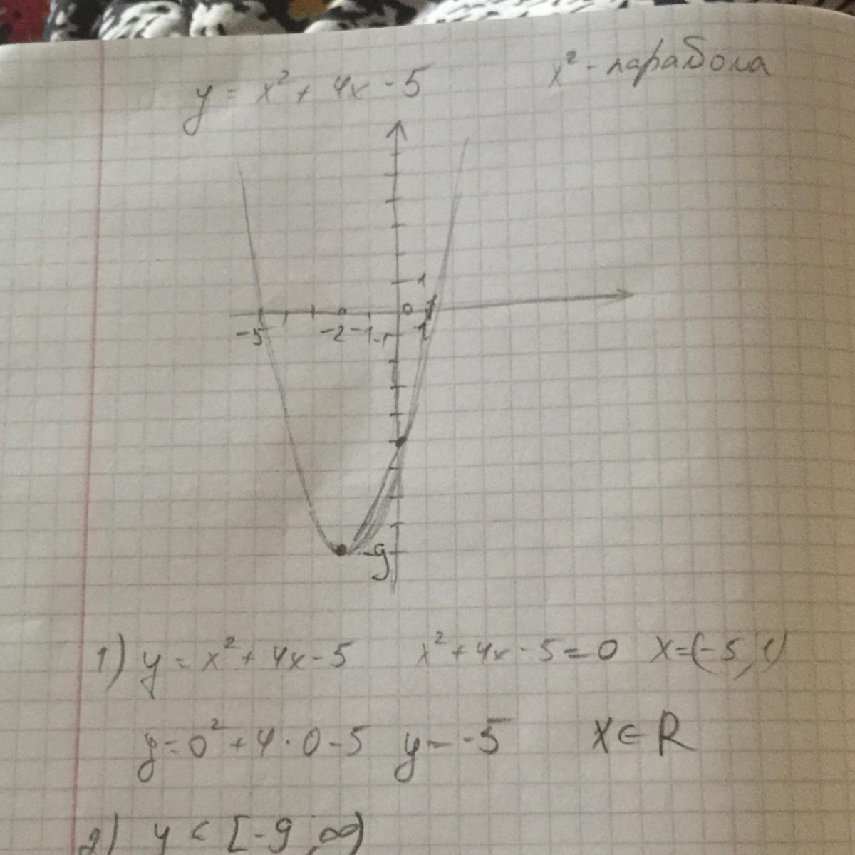 ДАМ 20 БАЛОВ! СРОЧНОООООО!!!Побудуйте графік функцій у= х2 + 4х-5. За графіком знайдіть: 1) область значень функції; 2) проміжок зростання функції.