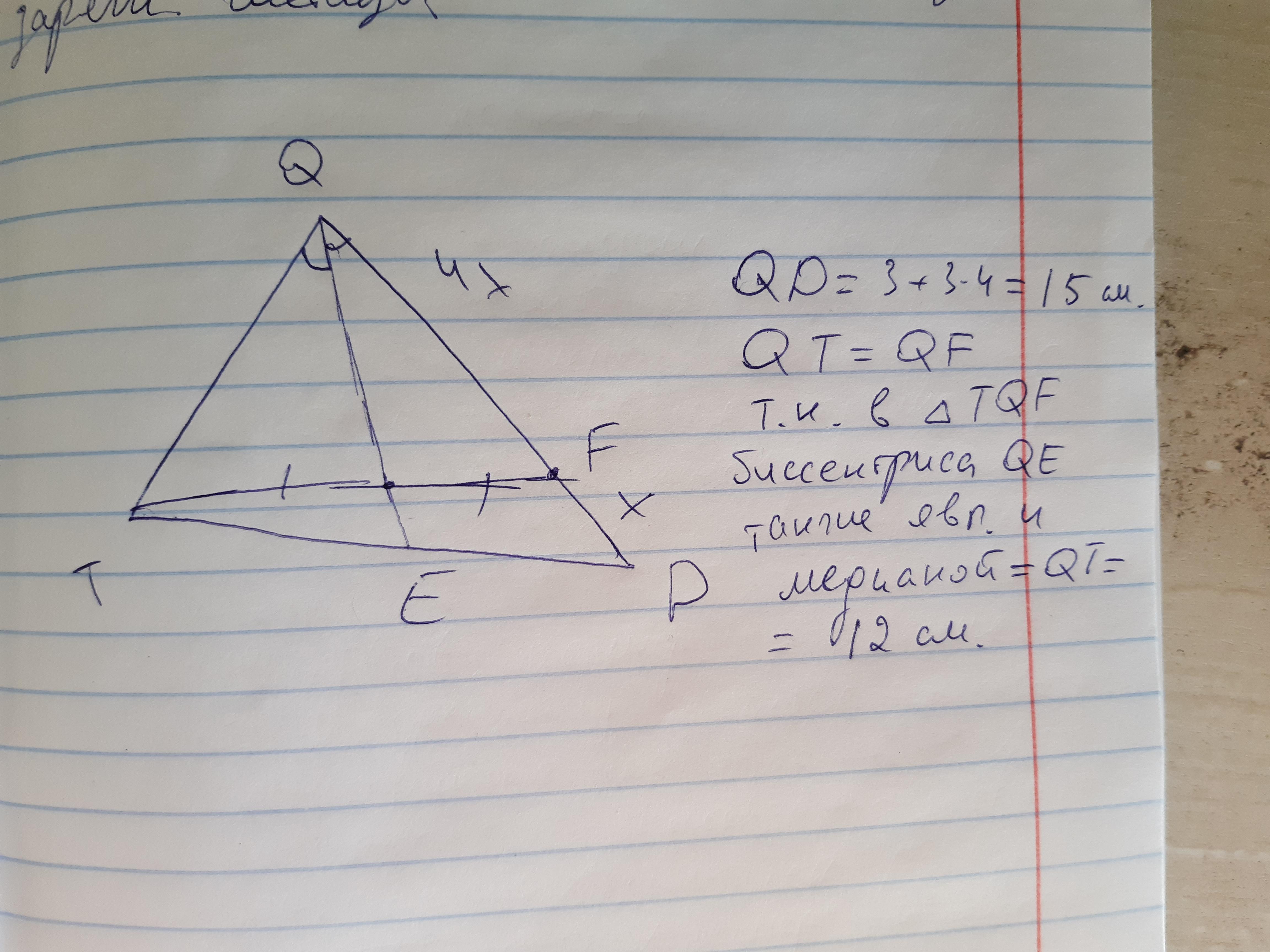 на стороне QD треугольника TQD отметили точку F так, что DF : FQ =1 : 4. Биссектриса QE пересекает отрезок TF в его середине. Найдите TQ, если известно, что DF = 3см.