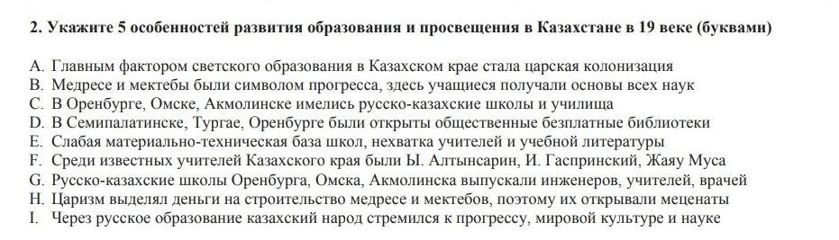 Укажите 5 особенностей развития образования и просвещения в Казахстане в 19 веке (буквами). помогите пожалуйста, срочнооо надо