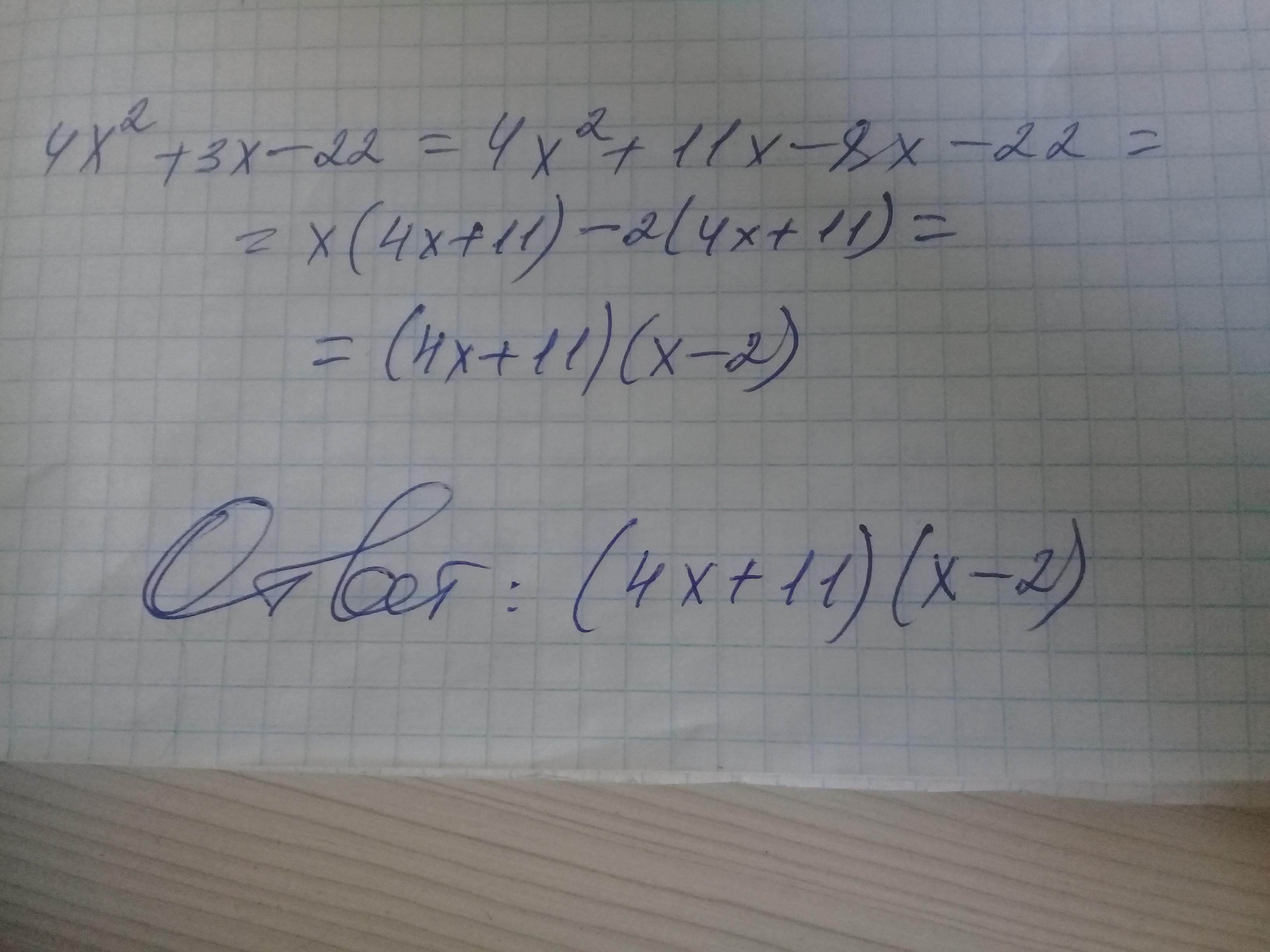Срочно Розкладіть на лінійні множники квадратний тричлен: 4 х2+3х-22
