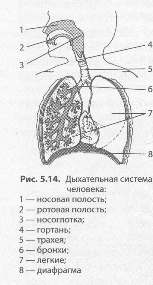 Носовая полость, ротовая полость, носоглотка, гортань, трахея, бронхи, лёгкие, диафрагма.