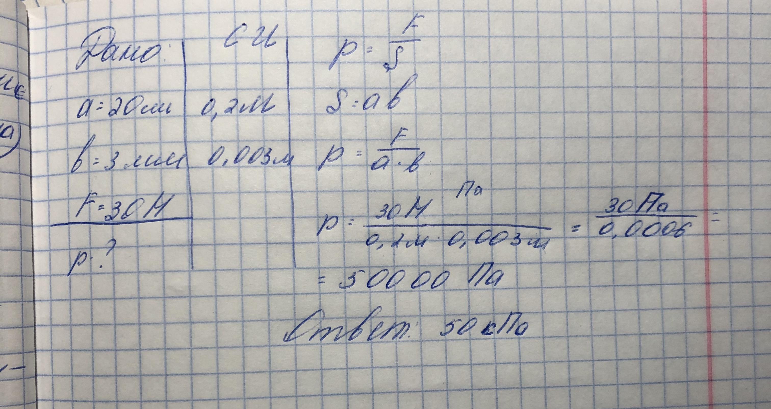 Ширина лезвия лопаты 20см,толщина 3 мм.Человек нажимает на лопату с силой 30Н.Определите давление лопаты на почву.