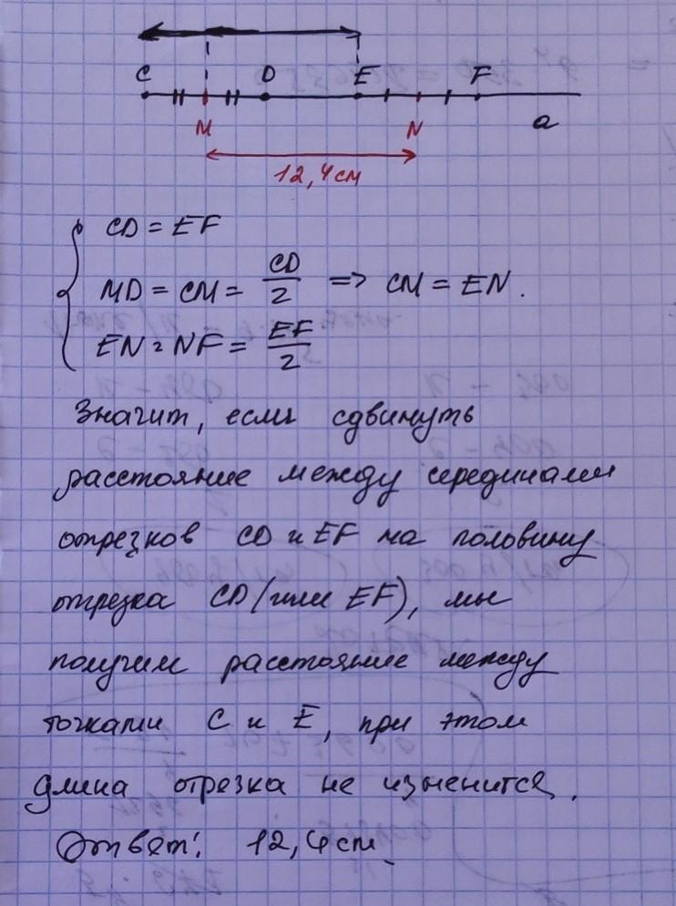 На прямой а отмечены последовательно точки C, D, E, F так, что CD = EF. Расстояние между серединами отрезков CD и EF равно 12,4см. Найдите расстояние между точками С и Е. ( c чертежом, пожалуйста)