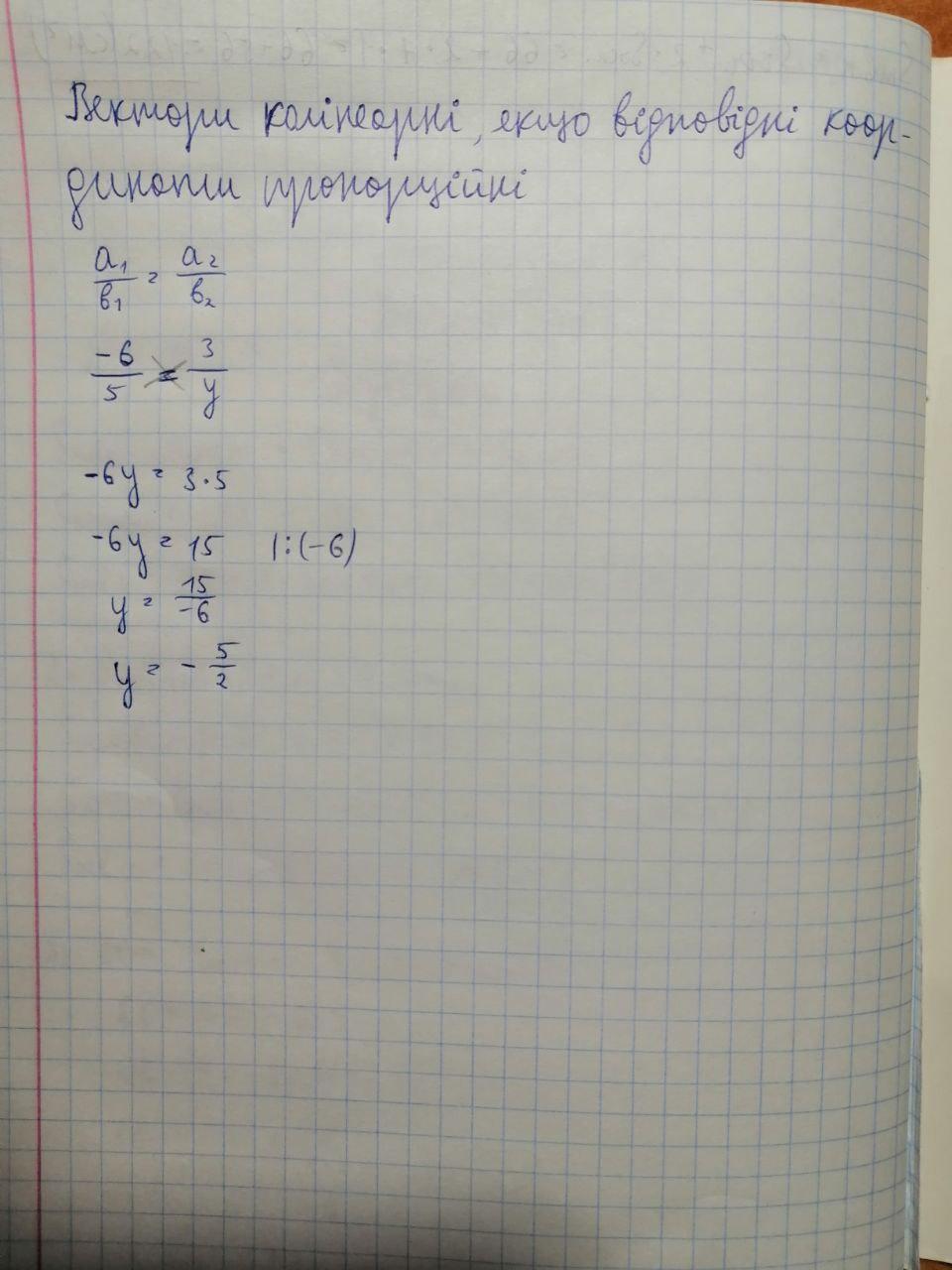 Знайдіть значення у , при якому вектор а(-6;3) і вектор в (5;у) є колінеарними.