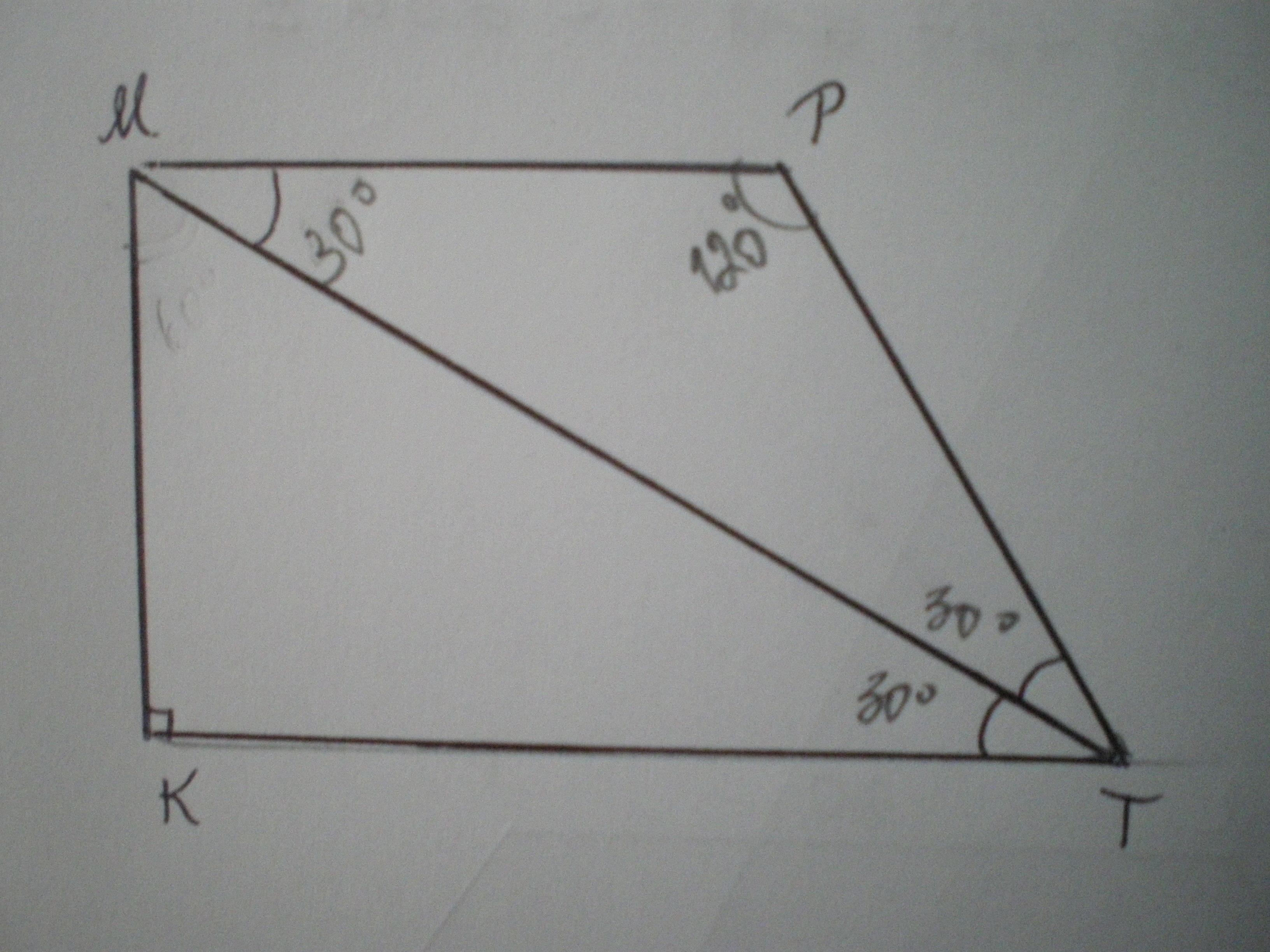 ∠РМТ=∠КТМ=30° як внутрішні різносторонні при МР║КТ та січній МТ, отже ∠Р=180-30-30=120°.