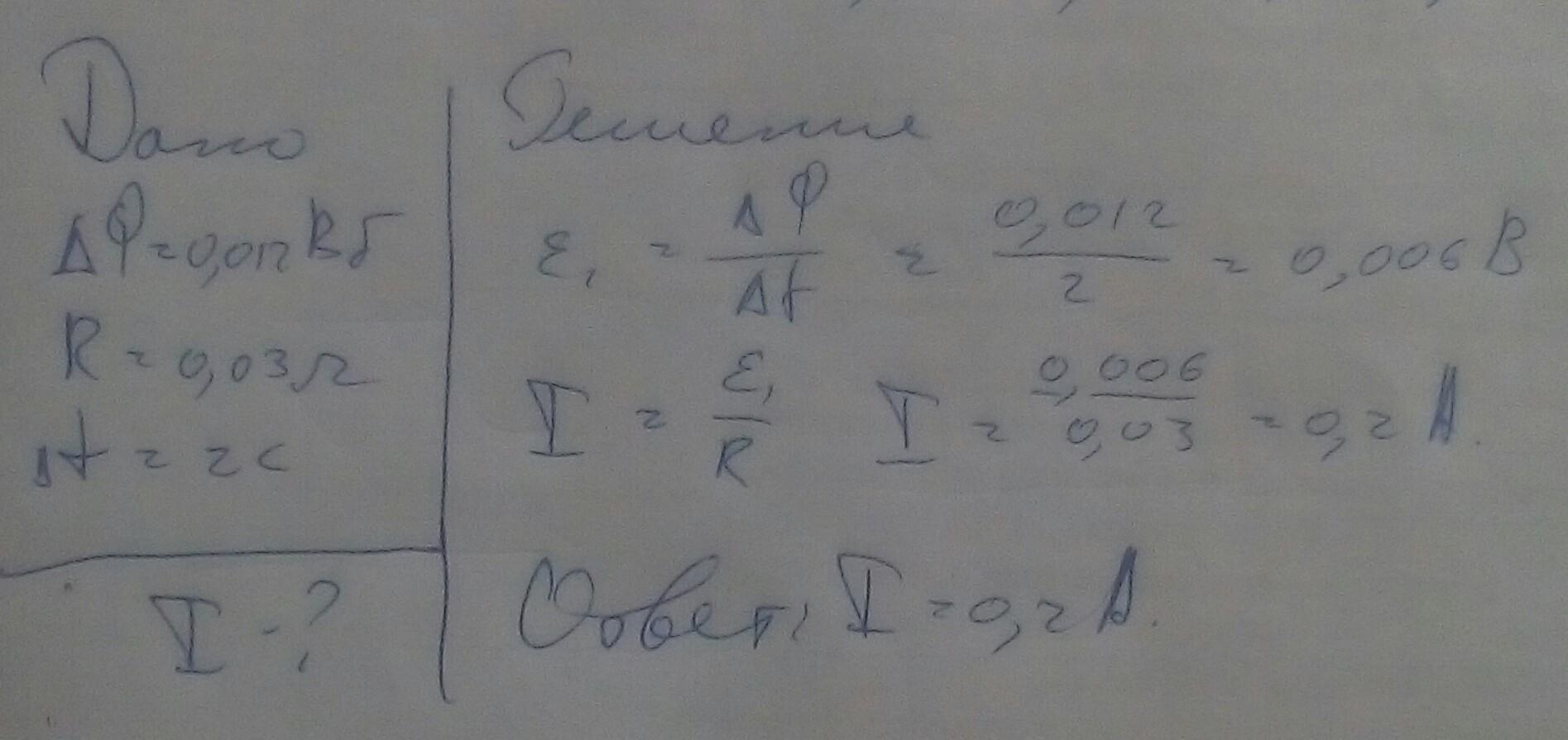 Магнітний потік через кільце з опором 0,03 Ом за 2 с змінився на 0,012 Вб. Обчислити струм