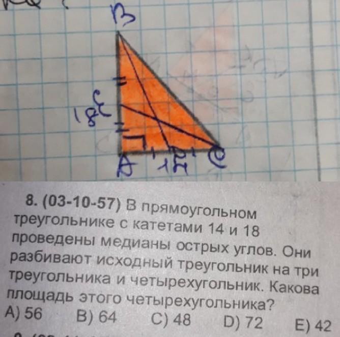 S=половине произведения катетов=14*18/2=7*18=70+56=126 кв.ед.