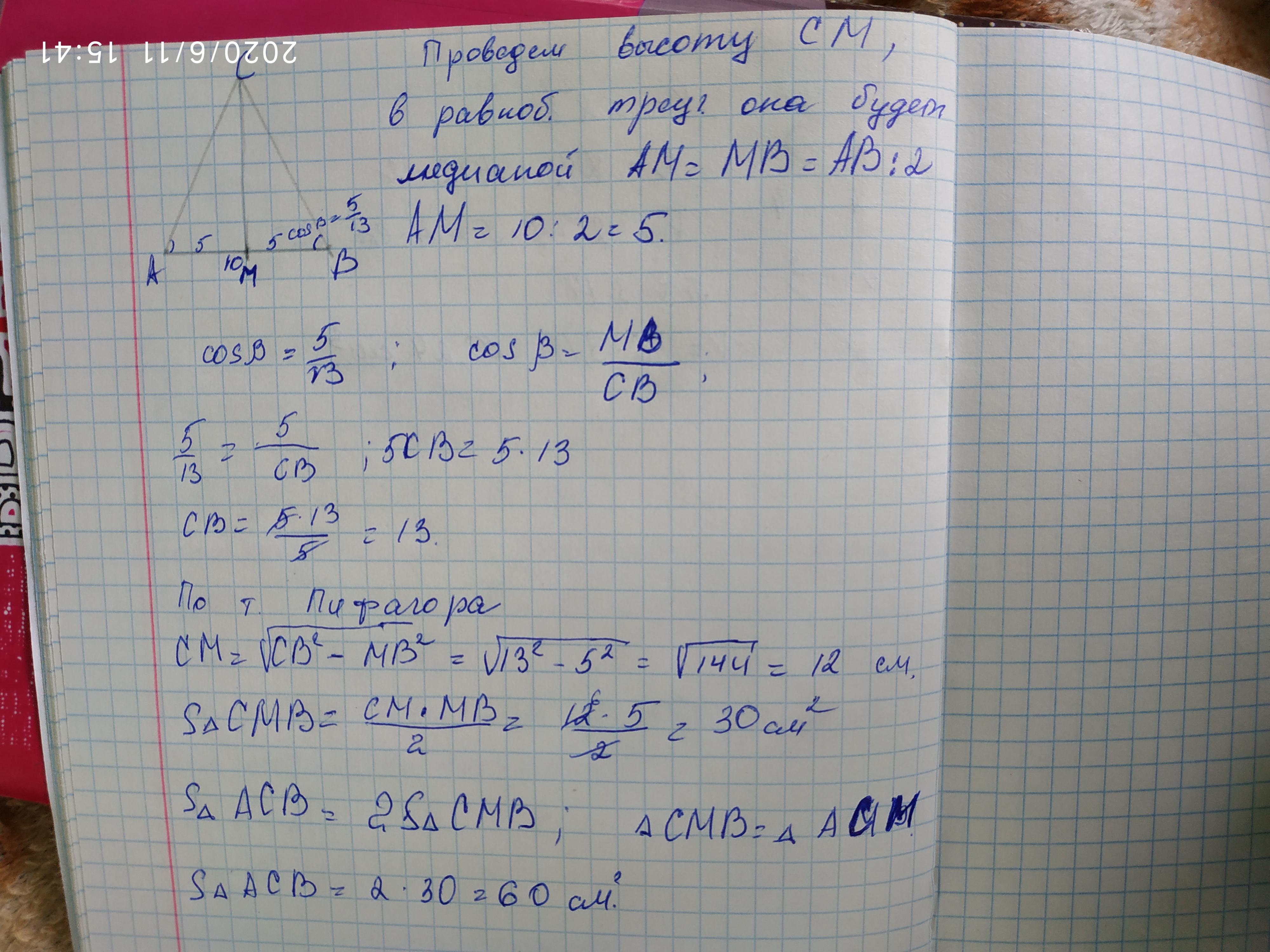 Найти лицо равнобедренного треугольника АВ=10 см cos a= 5 верху 13. (дробь) Фото для справки. Задание 11.